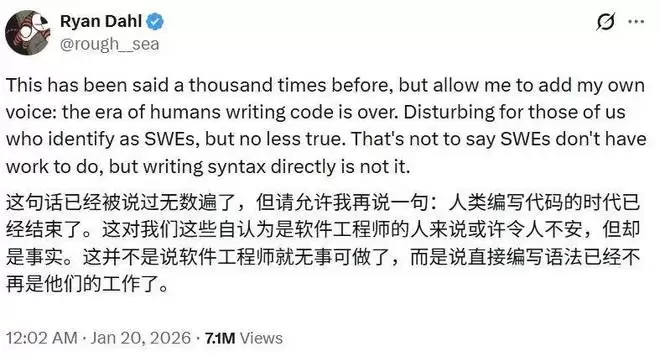 前两天,Node.js 之父 Ryan Dahl 在 X 上断言:「人类编写代码的时代已经结束了。」该帖引发广泛讨论,浏览量更是已经超过了 700 万。而现在,我们迎来了一个对这一判断的有力证明。