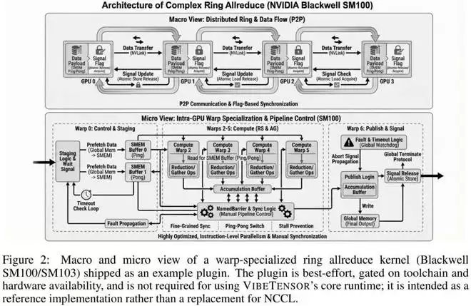 在 VibeTensor 的 Blackwell 评估中,AI 甚至基于 Fabric 构建了一个可选的环形全归约(Ring-allreduce)插件。这种插件直接绑定了 CUTLASS 的实验性内核,完全绕过了 NCCL。这意味着 AI 已经开始尝试从底层通信协议层面,去重构大规模分布式训练的逻辑。
