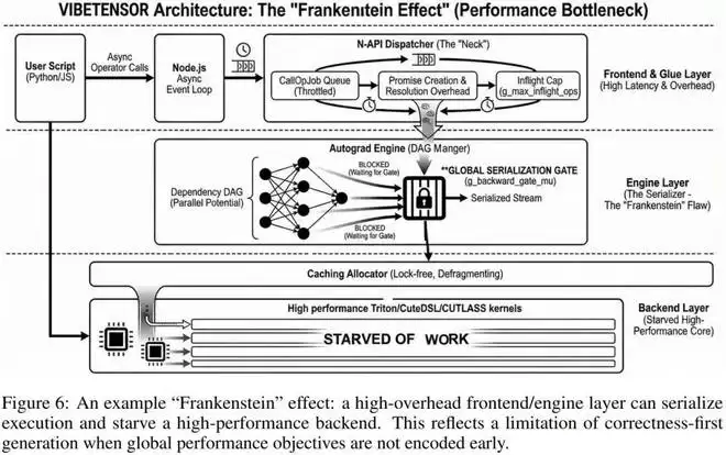尽管 VibeTensor 能够跑通复杂的神经网络模型,但许冰和团队在论文中诚实地提出了一个引人深思的概念:「弗兰肯斯坦效应(Frankenstein Effect)」。