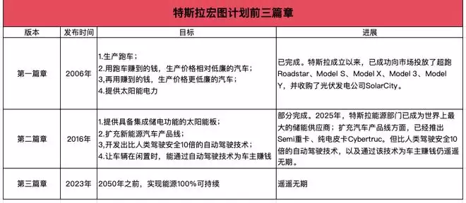 在成立之初,特斯拉为自己制定的使命是“加速世界向可持续能源的转变”。对于该使命的实现路径,马斯克在前三篇《宏图计划》中进行了展示,其主要内容为对新能源汽车和能源业务的展望。