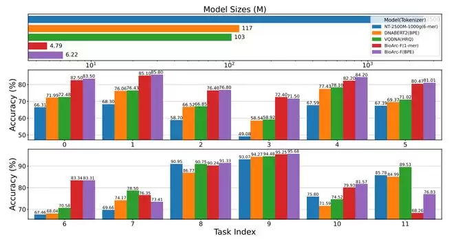 BIOARC 所使用的模型比当前流行的大型生物 AI 模型要小很多,但是表现却更加优秀。在一些 DNA 任务上,BIOARC 模型的大小只有传统模型的二十分之一,但是效果却能得到显著提升。这说明:不是模型越大越好,而是结构越合适越好。