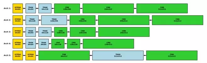 比如,在处理 DNA 序列的时候,BIOARC 发现高性能模型常常呈现出一种三层结构:先使用 Hyena 块捕捉长距离关系,再使用 Transformer 块理解复杂上下文,最后使用卷积神经网络块来提取关键局部特征。这种组合就像先观看整幅地图,再分析重要区域,最后聚焦的关键地标,一步步地理解整个序列的能力。