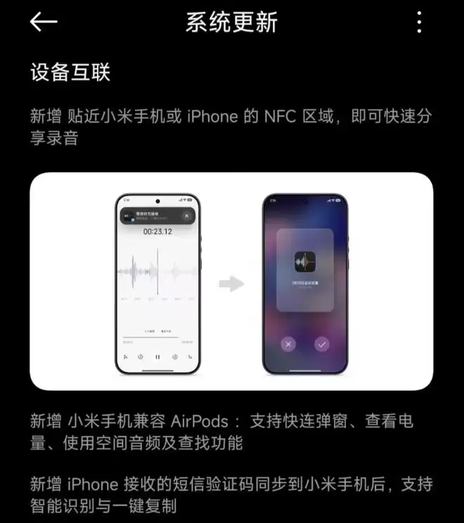 说到双持,这次的互联互通简直是在挖苹果的墙角,比如小米手机贴近iPhone,录音文件能直接飞过去;更绝的是iPhone收到的验证码,小米这边能同步识别并一键复制。