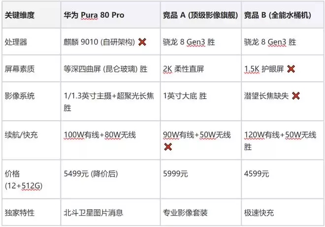 为了让大家更直观地看清这波降价后的竞争力,我做了一个简单的对比图,咱们拿Pura 80 Pro和市面上两款主流竞品对比一下: