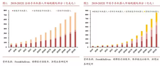 研报指出,根据Frost&Sullivan数据,2024-2032年中国手术机器人市场规模将从72亿元增长至767亿元人民币,年复合增长率约为34%。