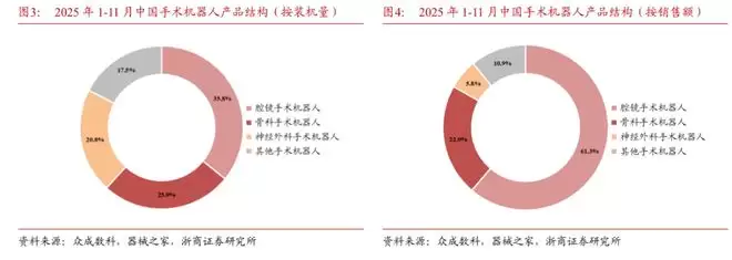 另外,骨科手术机器人市场规模仅次于腔镜机器人。根据众成数科2025年1-11月统计,骨科机器人占总体装机量的26%,占销售额的22%。