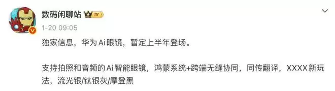 同时,参考同一位博主的爆料来看,华为Ai眼镜暂定上半年登场。支持拍照和音频的Ai智能眼镜,鸿蒙系统+跨端无缝协同,同传翻译,带来流光银、钛银灰、摩登黑等配色。