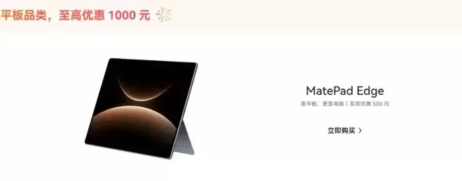 平板品类至高优惠1000元。华为MatePad Pro 系列、MatePad Edge 系列、MatePad Mini 系列、MatePad Air 系列、MatePad 系列、MatePad SE 系列等都有产品参与活动。
