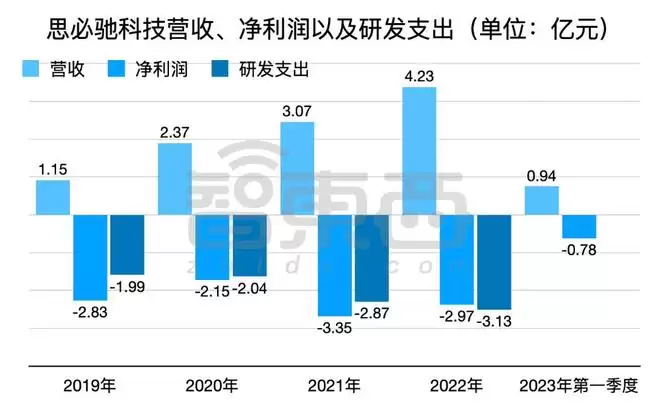据其2024年更新的招股书数据显示,2019年、2020年、2024年、2024年、2024年第一季度,思必驰营收分别为1.15亿、2.37亿元、3.07亿元、4.23亿元、0.94亿元,净利润分别为-2.83亿、-2.15亿元、-3.35亿元、-2.97亿元、-0.78亿元。2019年、2020年、2024年、2024年,其研发费用分别为1.99亿、2.04亿元、2.87亿元、3.13亿元,2024年数据未披露。