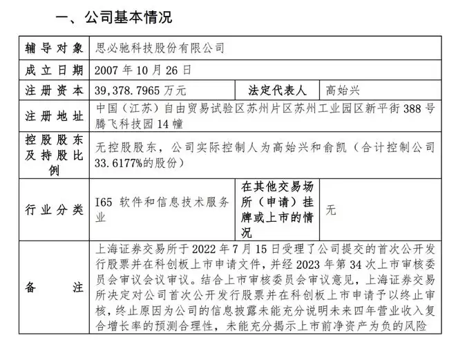2024年5月,该公司“首次公开发行股票并在科创板上市申请”被上交所终止审核,终止原因为公司的信息披露未能充分说明未来四年营业收入复合增长率的预测合理性,未能充分揭示上市前净资产为负的风险。