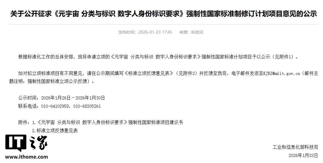 1月23日,据IT之家消息,工业和信息化部今日发布公告,就《元宇宙 分类与标识 数字人身份标识要求》强制性国家标准修订项目的征求意见稿,正式向社会公开征集意见。
