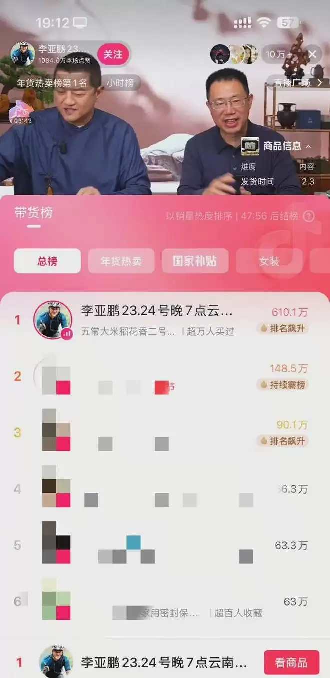 【李亚鹏直播带货成总榜第一,超10万人观看,多款产品刚上线被秒光!向网友鞠躬致谢,呼吁理性购物】近日,李亚鹏及嫣然天使儿童医院相关动态引起热议。1月23日,李亚鹏社交平台刚开播,直播间就迅速涌入超10万人在线观看。 直播不到半小时,就立刻冲上平台直播带货总榜第一,引得李亚鹏在直播间连连呼吁大家理性下单。从直播画面及带货榜单数据可见,李亚鹏的直播间热度居高不下,本场直播累计场观达3412.5万,在线观看人数峰值超10万+,无论是茶叶还是茶盘茶杯,上架即秒没。 截至发稿前,据最新数据平台,李亚鹏1月23日直播晚上7点开始,强势登顶抖音带货总榜第1名,以1683.8万的销售额领跑榜单,销售额远超第二名“与辉同行”(429.2 万),排名大幅飙升,成为年货节期间最受关注的带货主播之一。(每日经济新闻)