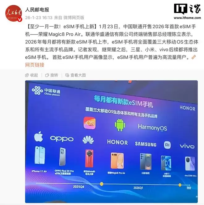 据IT之家1月24日消息,工信部旗下《人民邮电报》报道,联通华盛通信有限公司终端销售部总经理陈立在1月23日透露,从2026年开始,每月都将有新款eSIM手机面市,至少保持“一月一款”的节奏。届时,eSIM手机将全面覆盖三大移动操作系统生态及其所有主流手机品牌。