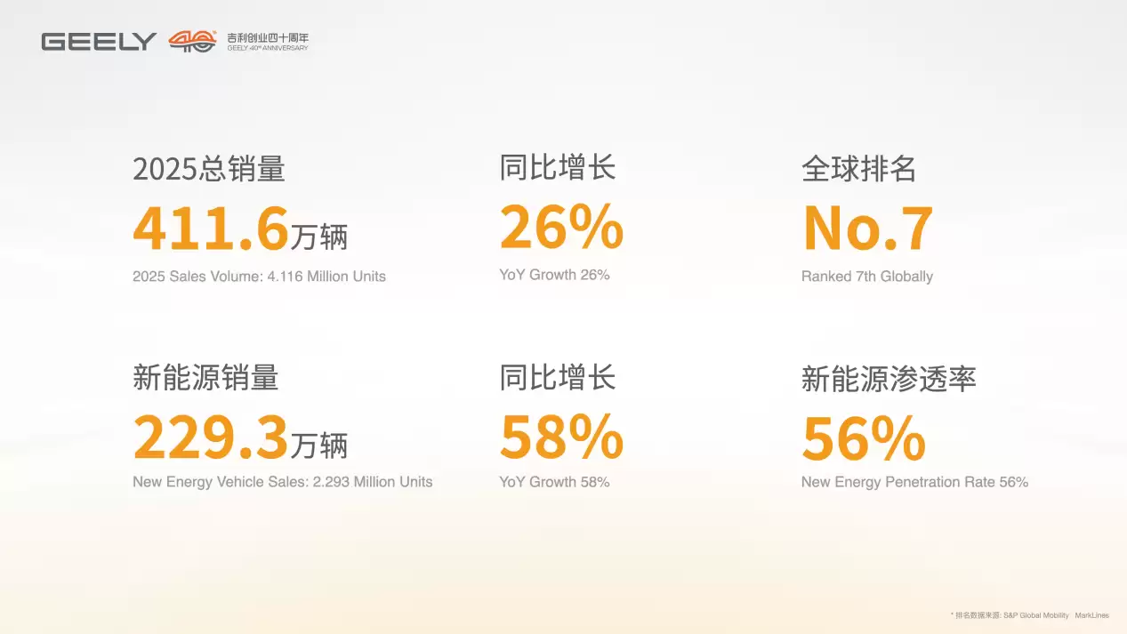 2025年,吉利控股以411.6万辆的总销量首次突破400万辆大关,其中新能源汽车销量达229.3万辆,渗透率攀升至56%。这一成绩不仅使其跻身全球汽车集团销量第七,更以26%的同比增速成为前十中增长最快的企业。吉利控股集团CEO安聪慧指出,未来五年将是集团实现三大战略升维的关键期:从产品制造转向生态服务竞争力,从规模成本优势转向绿色智能科技优势,从品牌独立运营转向全球深度协同。