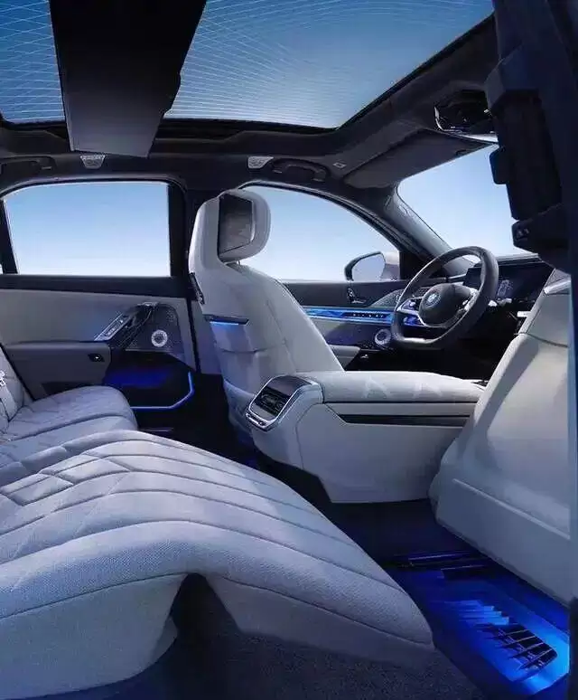外观设计上,2026款新7系延续了经典的家族风格,整体变化含蓄而精致。前脸标志性的大尺寸双肾格栅依旧醒目,内部采用竖条装饰,边缘环绕着银色饰条,辨识度极高。车灯采用分体式设计,上下均为扁平造型,点亮后科技感十足。前杠设计简洁利落,两侧设有小进气口,运动版车型在此基础上增加了黑色装饰组件,更显酷炫动感。车身侧面线条流畅且富有肌肉感,搭配20或21英寸多辐轮圈(具体视版本而定)。车窗饰条、B柱、C柱以及门把手都进行了熏黑处理,整车长宽高分别为5391mm×1950mm×1548mm,轴距与老款相同,为3215毫米。车尾部分,尾灯细长,红白配色并镶嵌黑边,即便不点亮也十分醒目。保险杠设计干净利落,排气管道隐藏其中。运动版车型则采用大块黑色塑料打底,搭配亮银包边,运动气息更为浓郁。