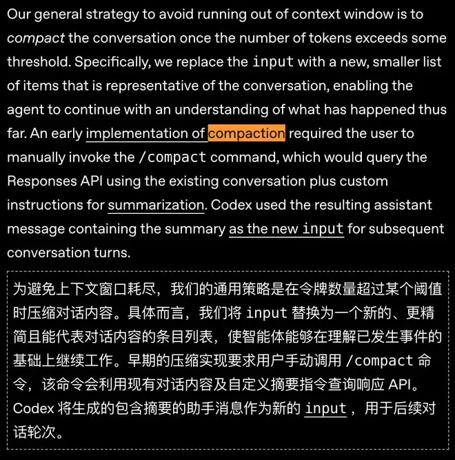 当Token数超过阈值,Codex不会简单地「删除旧消息」,而是会调用一个特殊的/responses/compact接口,把对话历史「压缩」成一个更短的摘要。
