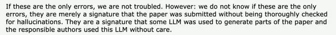 「如果这些是仅有的错误,我们并不担忧,但无法确定这些就已经是全部的错误。这些错误表明该论文在提交时未经过彻底的幻觉检查,作者在使用AI时也缺乏应有的谨慎。」