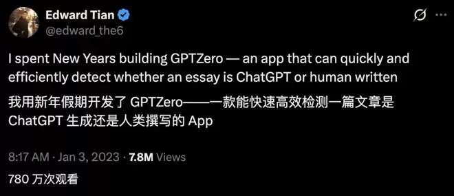 GPTZero CEO Edward Tian将其称作一个重要的节点时刻: