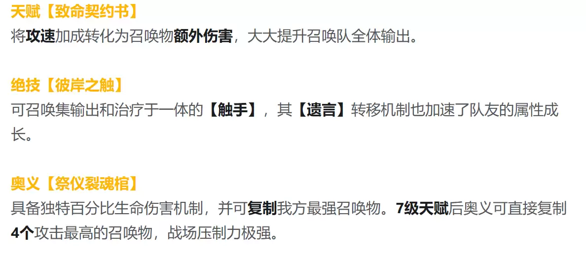 深入拆解圣女的技能体系,你将发现人海战术与属性成长的巧妙结合。丝碧莫的天赋能将攻击速度转化为召唤物的伤害加成,从而解决了召唤队后期乏力的痛点。其绝技召唤出的触手可以同时兼顾输出与治疗,而独特的“遗言转移”机制,更能将阵亡单位的损失转化为队友的属性增益,形成一种越战越强的良性循环。其核心奥义,在于七级天赋解锁后能够瞬间复制出四个强力的召唤单位。