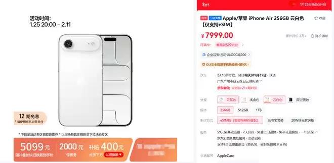 1月23日晚间,苹果旗舰店开启了针对iPhone Air的限时优惠活动,最新立减2000元,再叠加国家补贴后到手价5499元起。而在主流电商平台上,iPhone Air的价格同样进一步下探,在叠加官方以旧换新补贴后,实际支付金额约为5099元。