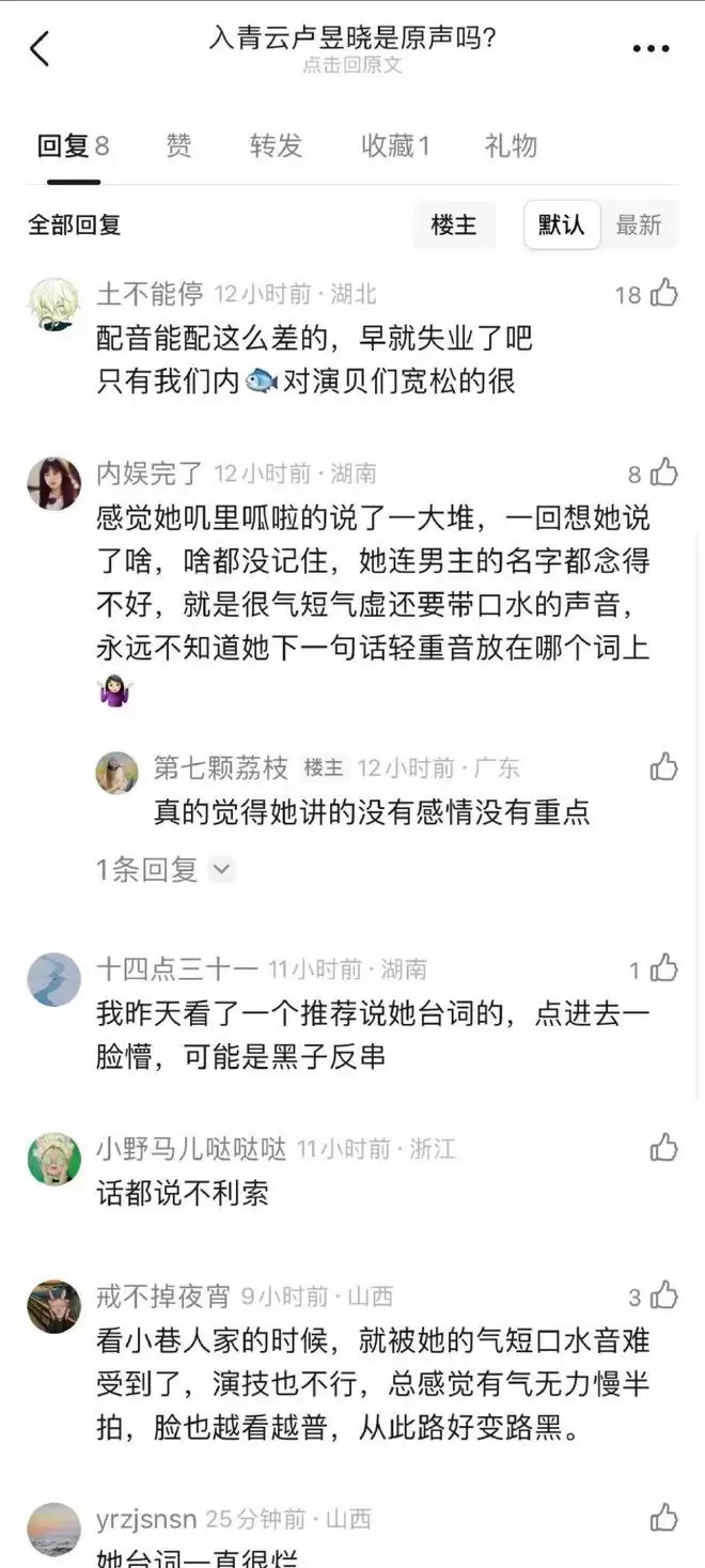 女主角卢昱晓成为前期最大的炮火,开播初期被骂演技差,她的台词功底受到不少质疑,感觉嘴巴没怎么张,黏糊糊的台词就出来了。尤其在语速加快或情绪激烈的戏份,发音模糊导致需依赖字幕才能理解内容,气短虚浮,像含着棉花说话。之前在《入青云》也被说过台词差,认为该找配音。