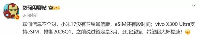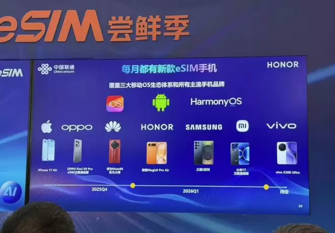 关键说到eSIM技术,近期有一张网传的中国联通PPT显示,三星Galaxy S26系列、小米17卫星通信版等eSIM机型将于今年第一季度发布。