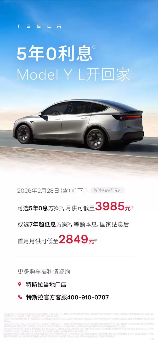 此外,消费者在2月28日前订购Model 3、Model Y以及Model Y L车型,仍可继续享受7年期超低息购车方案。其中,Model 3首付7.99万元起,首月月供最低1759元;Model Y首付7.99万元起,首月月供最低2188元;Model Y L首付9.99万元起,首月月供最低2849元。消费者亦可选择5年0息购车方案作为备选。