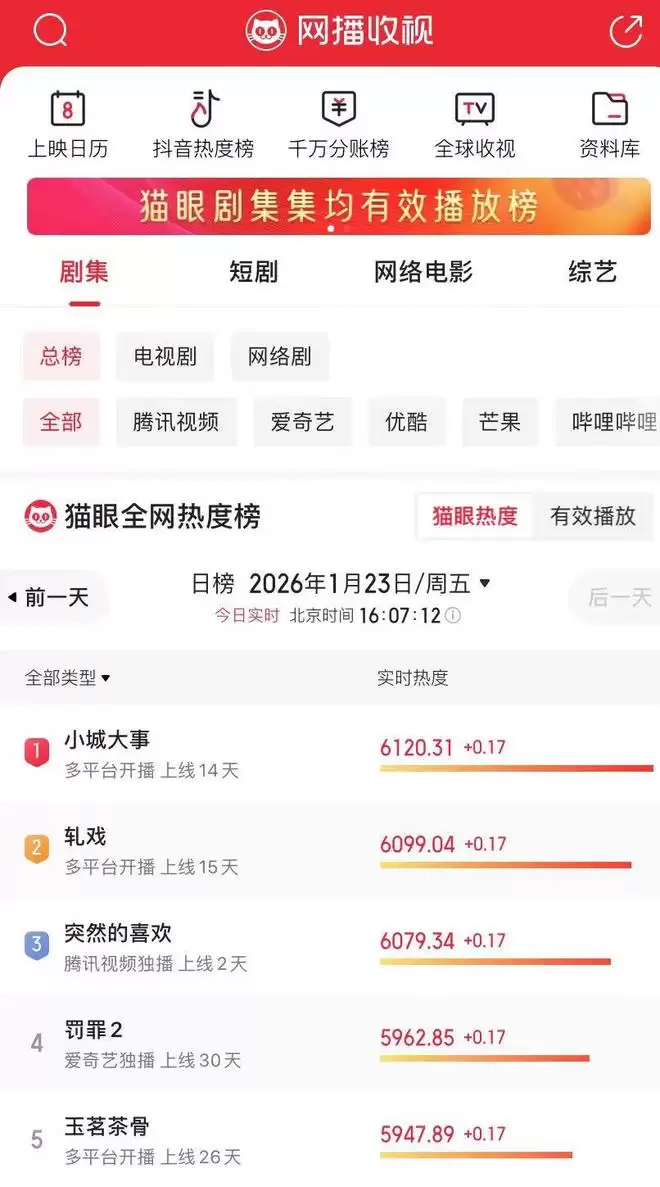 由赵丽颖和黄晓明主演的电视剧《小城大事》目前正在热播,其热度稳居榜首。