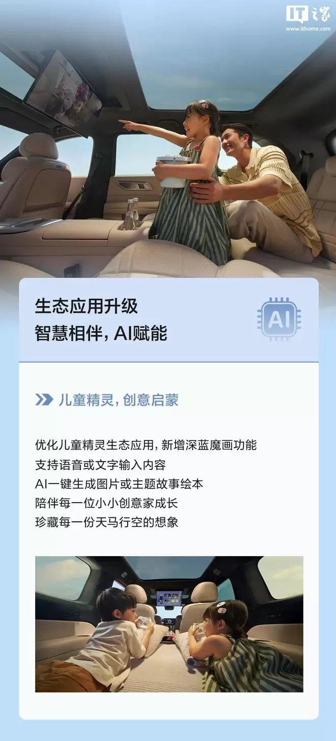 鸿蒙座舱HarmonySpace 5 对音响音效进行了优化,低频表现更为澎湃,中频更加润泽,进一步提升了影音体验的沉浸感。新增应用内置DLNA投屏功能,当手机与车机连接同一WiFi后,支持DLNA协议的App(如腾讯视频、爱奇艺、优酷视频等)可直接将内容投射到车机屏幕上。生态应用方面,对儿童精灵生态应用进行了优化。新增深蓝魔画功能,支持通过语音或文字输入描述内容,由AI一键生成图片或主题故事绘本。升级注意事项:升级时,请将车辆停靠在安全区域(平缓路段)并保持静止;升级期间请暂勿充电;升级过程中,可能会出现屏幕短暂熄灭或重启、仪表盘故障灯短暂提示等情况,均属正常现象,请勿进行人为干预。若确认升级,可在车机端点击立即升级按钮,或通过车机端/手机App的预约升级功能,系统将自动完成更新。预计本次整体升级时间约为20分钟,具体时长可能因网络环境而异,推荐使用预约升级功能。若系统提示升级失败,软件版本将还原至原版本,不影响车辆正常使用;您可检查车辆状态后选择合适时间重新升级,也可联系深蓝管家,或前往深蓝汽车维保中心由工作人员协助完成升级。