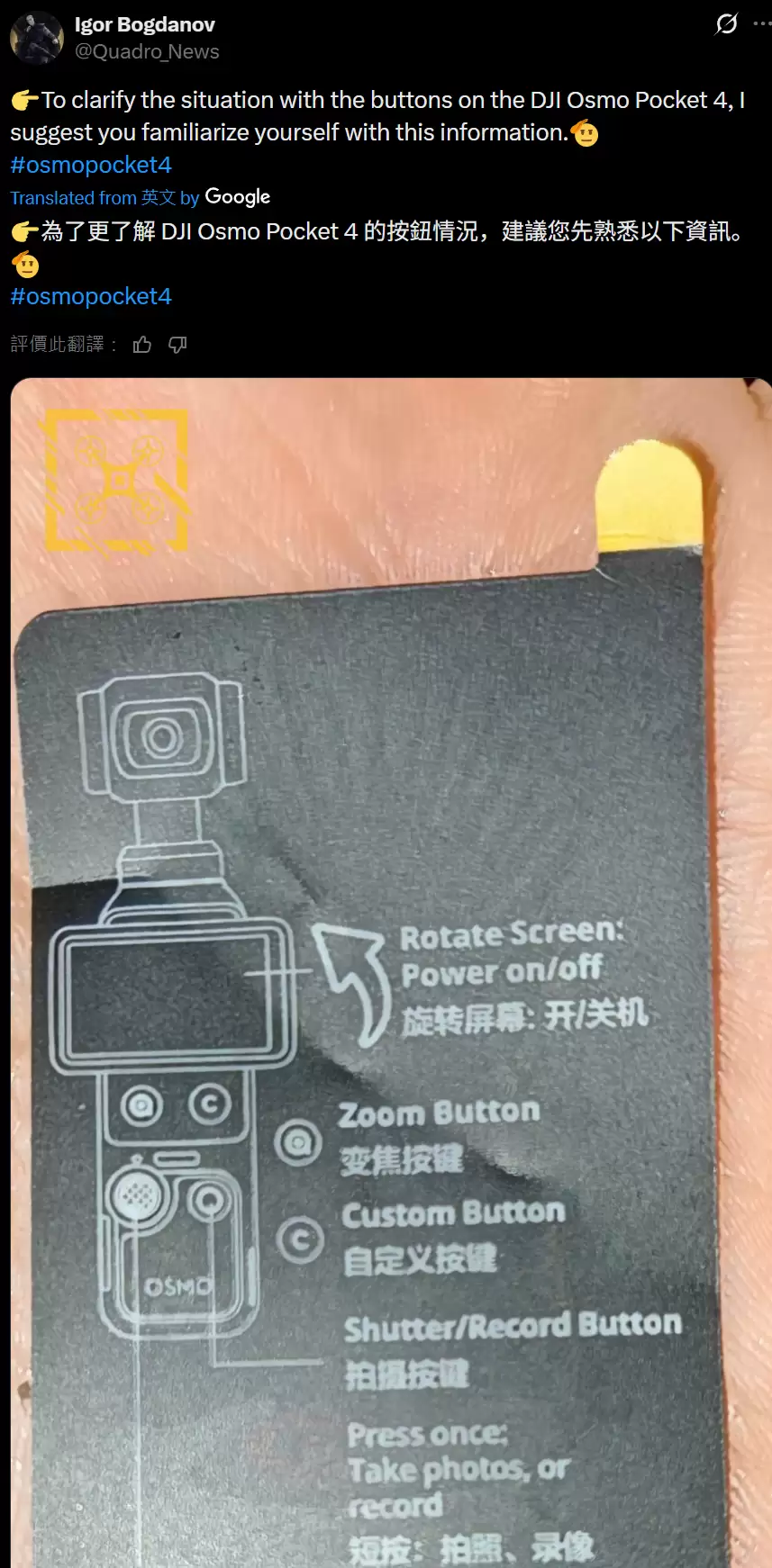 结合IT之家昨日援引Igor Bogdanovji的爆料,大疆Osmo Pocket 4标准版手持云台相机此前也已曝光。其外观与前代产品Pocket 3相比几乎没有明显变化,整体依然延续大疆的经典造型。上方配备一枚单摄,下方则是一块可旋转屏幕,屏幕下方的转轴处配有多枚实体按键,其中一枚是变焦键,另一枚则是自定义的C键。