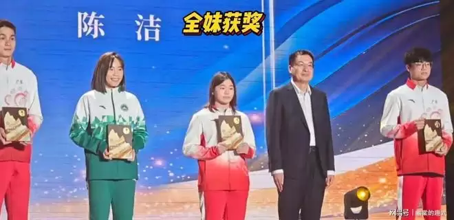 只见领奖台上的全红婵一头及肩长发身上是红白相间的领奖服校长来给她颁奖时她还在裤子上擦了擦才接。