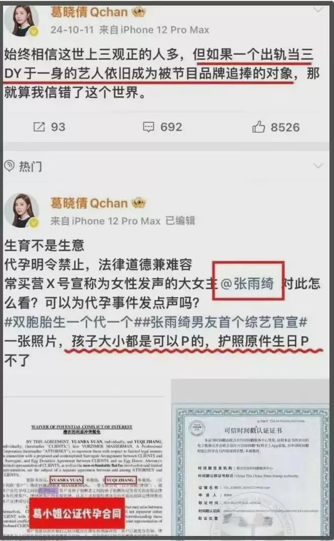 葛晓倩态度好强硬!针对张雨绮涉嫌代孕一事,她反复质疑了好多次,除了点名道姓公开喊话,葛晓倩还晒过对方代孕合同。