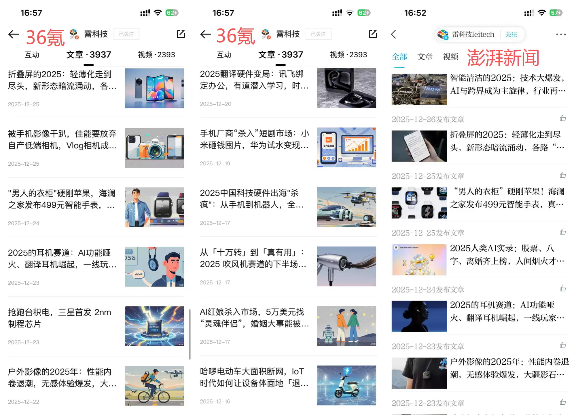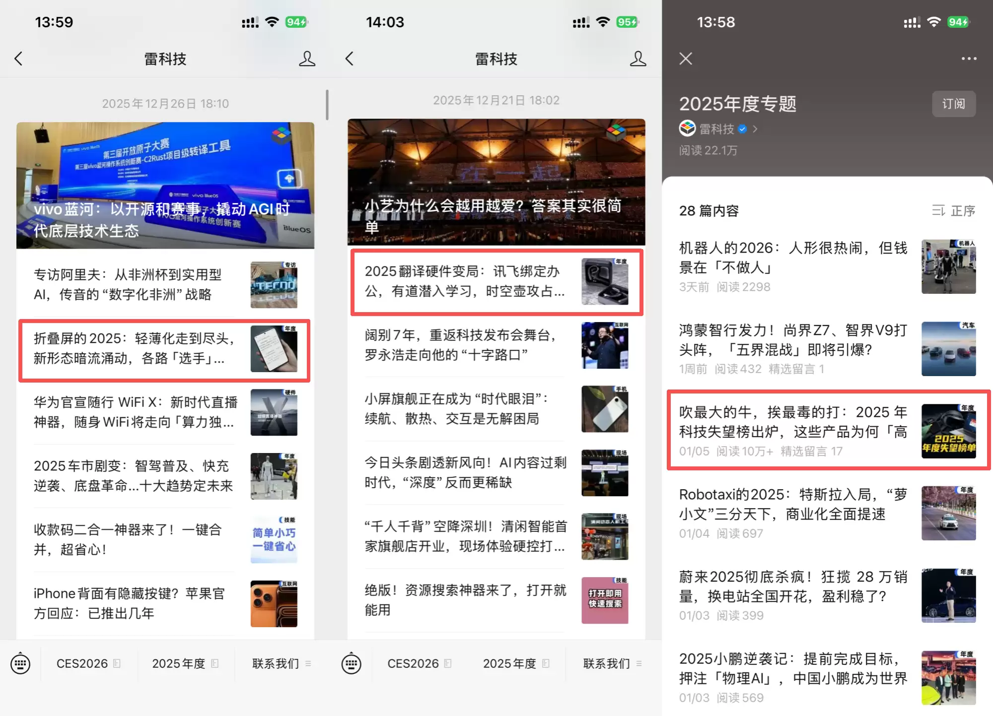 截至目前,“雷科技·年度”专题已产出29篇深度内容,雷科技/电车通编辑团队累计撰文超过十万字,对2025年科技产业格局进行了全景式盘点。相关内容在雷科技自有全渠道及36氪等合作平台,累计收获超过600万次阅读/播放。