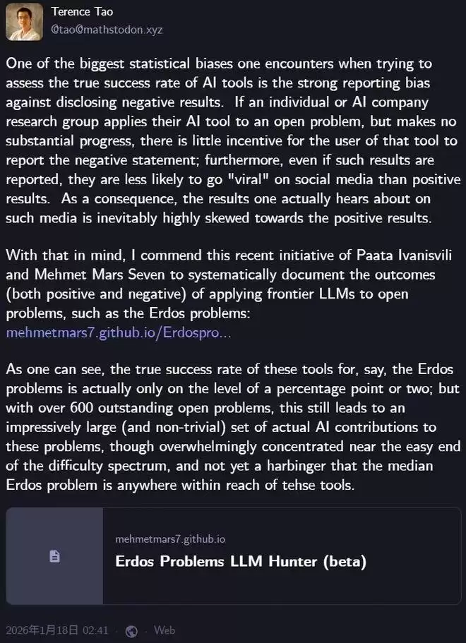 当然,陶哲轩也反复强调,这些被AI快速解决的Erdős问题多属于「最低垂的果实」——可以用标准工具、只是之前没人费心去组合的那一类。