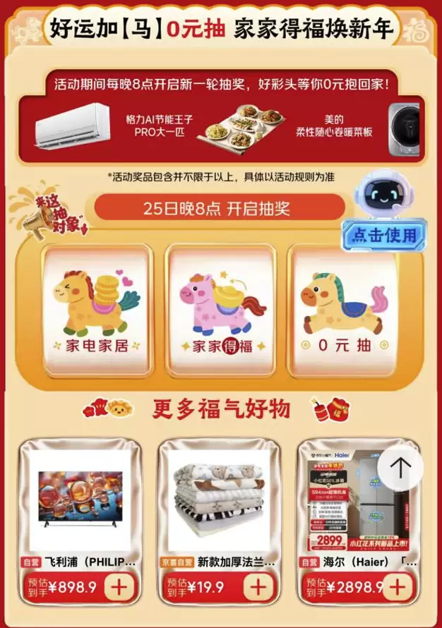 除了直接选购,还能试试手气:价值5999元的三星量子点游戏电视、价值3519元的海尔12KG大容量洗衣机、价值3333元的格力AI节能王Pro大一匹等品质家电家居产品,均有机会在“福袋0元抽”活动中免费带回家。