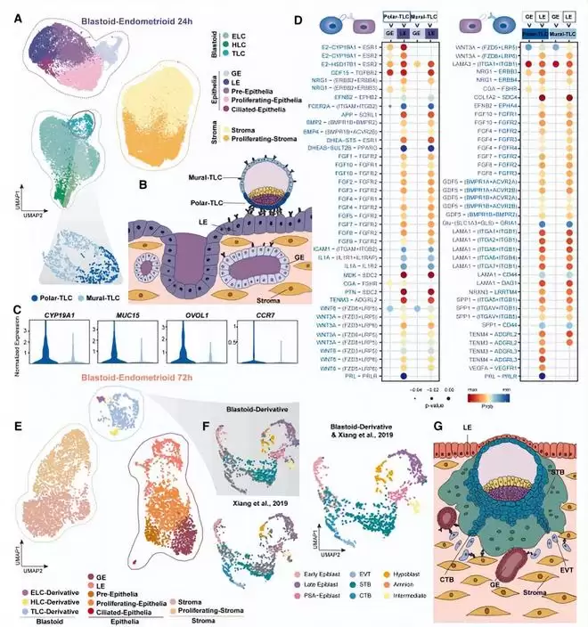 对侵入后 72 小时样本的分析,进一步揭示了滋养层细胞衍生物与子宫内膜各细胞类型之间更为精细和特异的互作网络,进而填补了人类胚胎植入机制认知空白。