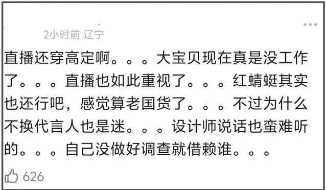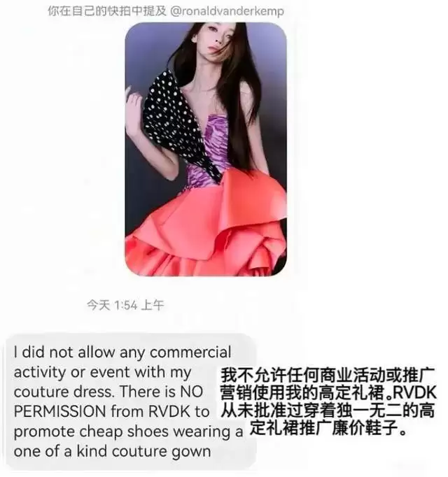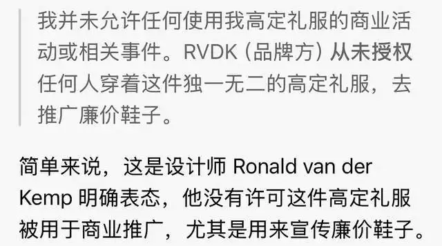 当高定品牌设计师得知baby穿着自家衣服去带货直播之后,立马发了火,明确表示从未授权baby穿着他家高定参加商业活动,特别是宣传cheap shoes(廉价鞋子),嫌弃之意溢于言表。