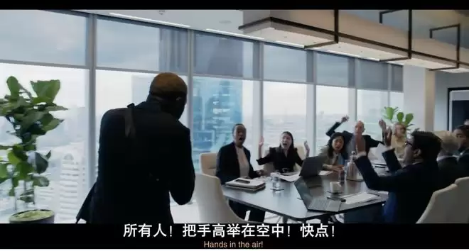 进了电梯后就拿出了真家伙,到了目标楼层,拿着恐怖武器,用5分钟时间就控制了一家庞大的金融机构及其所有员工。