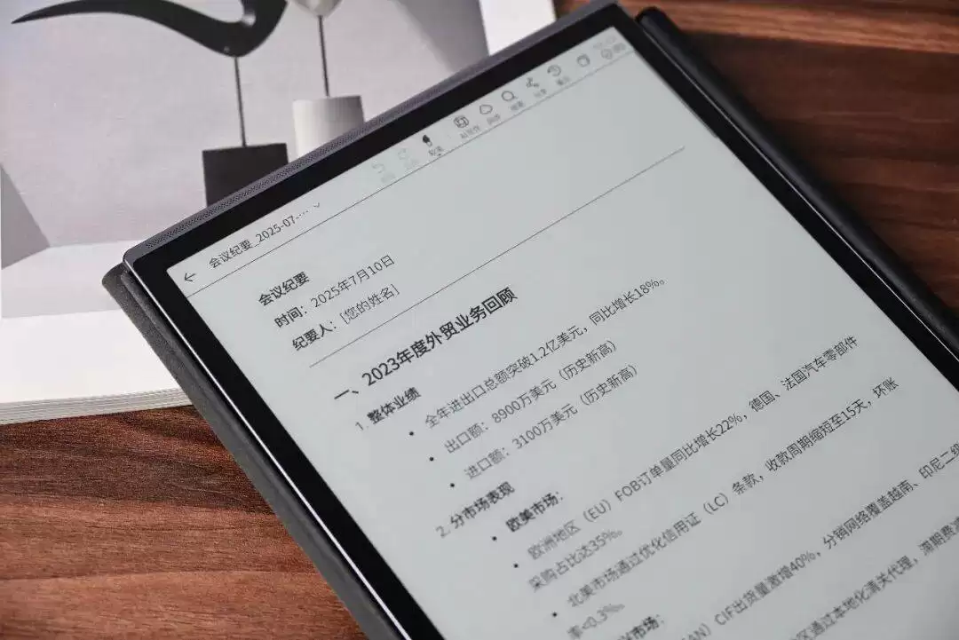 硬件配置方面,10.65英寸的E Ink墨水屏以300 PPI的高分辨率,呈现了媲美纸质书的舒适阅读体验。屏幕表面采用防眩光磨砂玻璃处理,配合仅4.6毫米的超薄机身,兼顾了出色的质感与便携性。设备内置大容量高压电池,结合墨水屏天生的低功耗特性,足以满足全天候的移动办公需求。在数据安全层面,机身侧边特别设计了物理离线拨键。一键启动后,设备将自动切断所有网络连接,所有笔记内容均存储于本地加密存储器中,用户需通过指纹或密码验证才能访问,为商务机密信息提供了硬件级的安全保障。