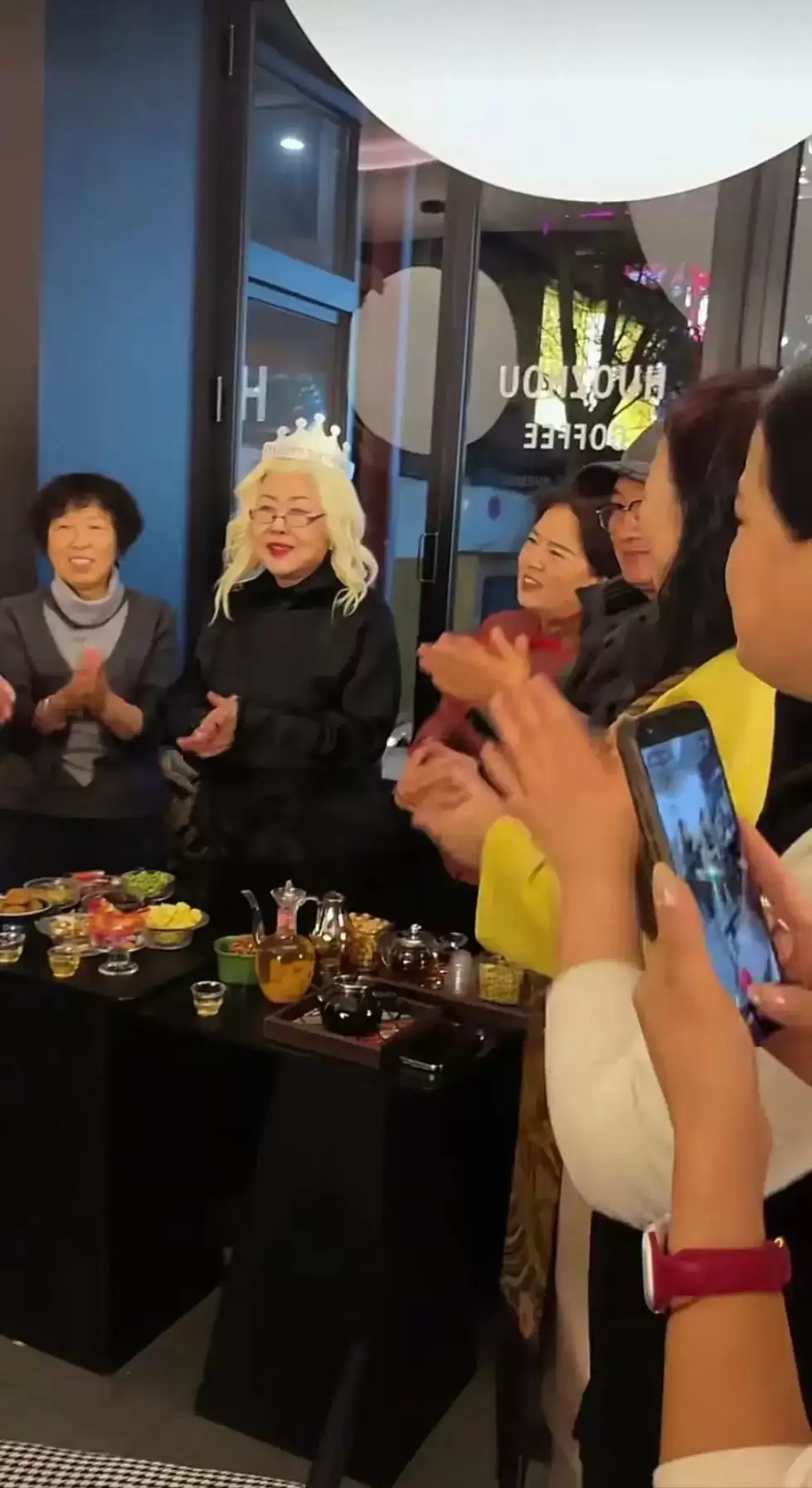 照片中的斯琴高娃老师,穿着黑色中式上衣,一头银发,配上红唇,当时正在默默记着台词。她连妆都没来得及卸,就被拉过来庆祝生日了。