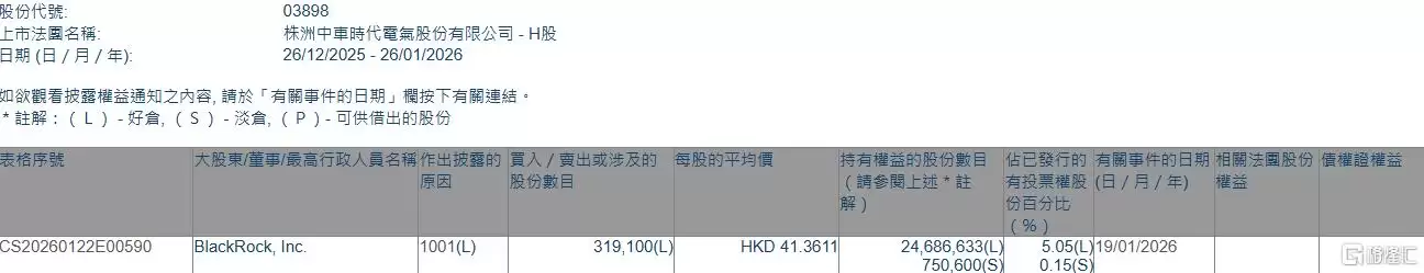 根据联交所最新权益披露资料,格隆汇1月26日|2026年1月19日,时代电气(03898.HK)获BlackRock, Inc.在场内以每股均价41.3611港元增持31.91万股,涉资约1319.83万港元。