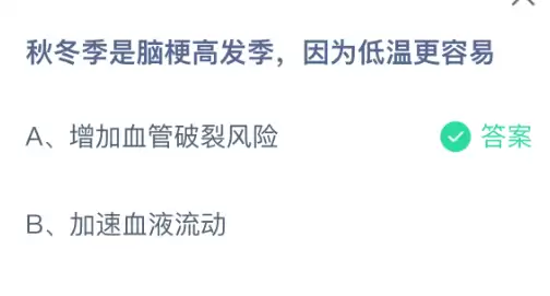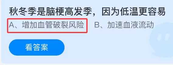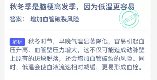 秋冬季节为什么会成为脑梗的高发期?很多人可能会想到“气温低”这个因素。支付宝小鸡课堂开课了,每天只需花一分钟答题赚饲料,喂喂小鸡就能参与公益献爱心,轻松又充满意义!2026年1月25日蚂蚁庄园的小鸡课堂题目正确答案是【增加血管破裂风险】。这是因为天气寒冷时,人们长时间处于低温环境中,血管会自然收缩,导致血压升高。那些已经硬化、变得细小的血管,可能无法承受突然增大的内部压力,从而发生破裂,最终引发脑出血。
