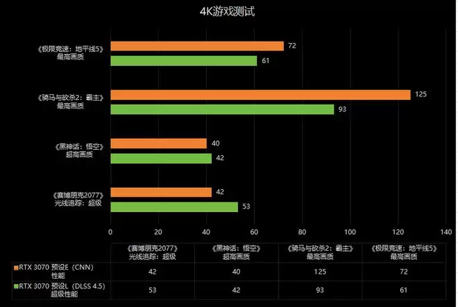 4K分辨率我们只测试了RTX 2080 SUPER显卡,在《赛博朋克2077》中,DLSS 4.5的帧率比CNN模型高约16%,《黑神话:悟空》和CNN模型持平。另外两款游戏的平均帧率分别下降了约33%和18%。