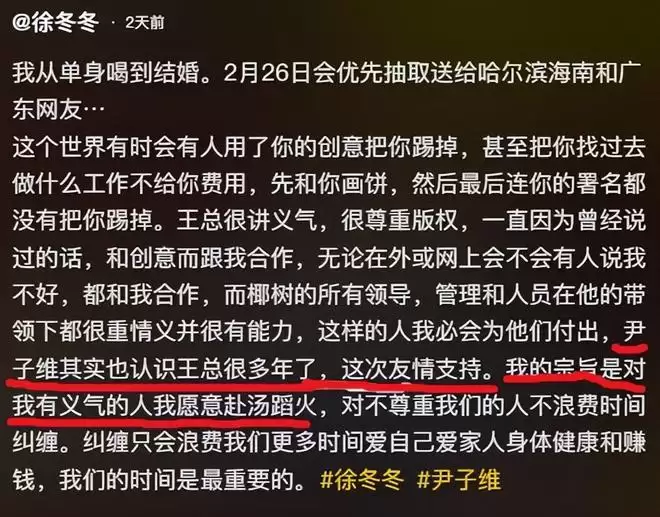 近日,徐冬冬在个人账号接连发声支持椰树品牌。