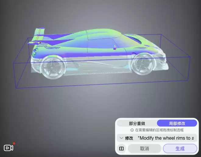 整体生成时,只需确保整个模型在材质、光影、纹理等层面统一风格即可。局部修改却要求修改区域的细节与未动部分无缝融合。稍有不对劲,比如纹理粗糙度略有差异、光影过渡不自然,就会在视觉上产生割裂感。