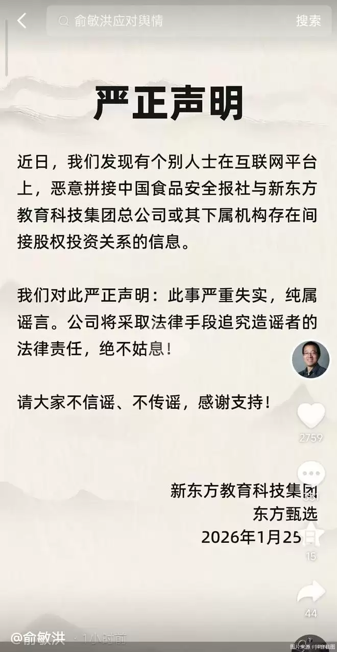 北京商报讯(记者 吴其芸)1月26日,新东方创始人、新东方教育科技集团董事长俞敏洪通过社交媒体发布严正声明指出,近日公司发现,有个别人员在网络平台上,通过恶意拼接信息,编造并散播关于中国食品安全报社与新东方教育科技集团总公司或其下属机构存在间接股权投资关系的谣言。