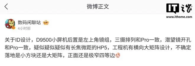 博主还在今天中午补充道,这台手机的后摄模组位于机身左上角,三摄排列和Pro版本一致,潜望式镜头的开孔也和Pro版相同,疑似是具备长焦微距功能的HP5传感器。不过工程机采用了横向大矩阵设计,尚不确定最终量产版会采用小方块还是大矩阵方案。