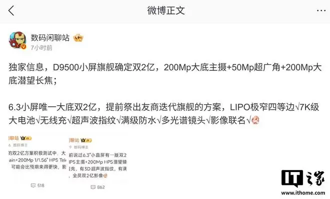 IT之家1月26日讯,博主@数码闲聊站今天在微博透露,某厂商天玑9500小屏旗舰机确认搭载双2亿像素CMOS传感器。