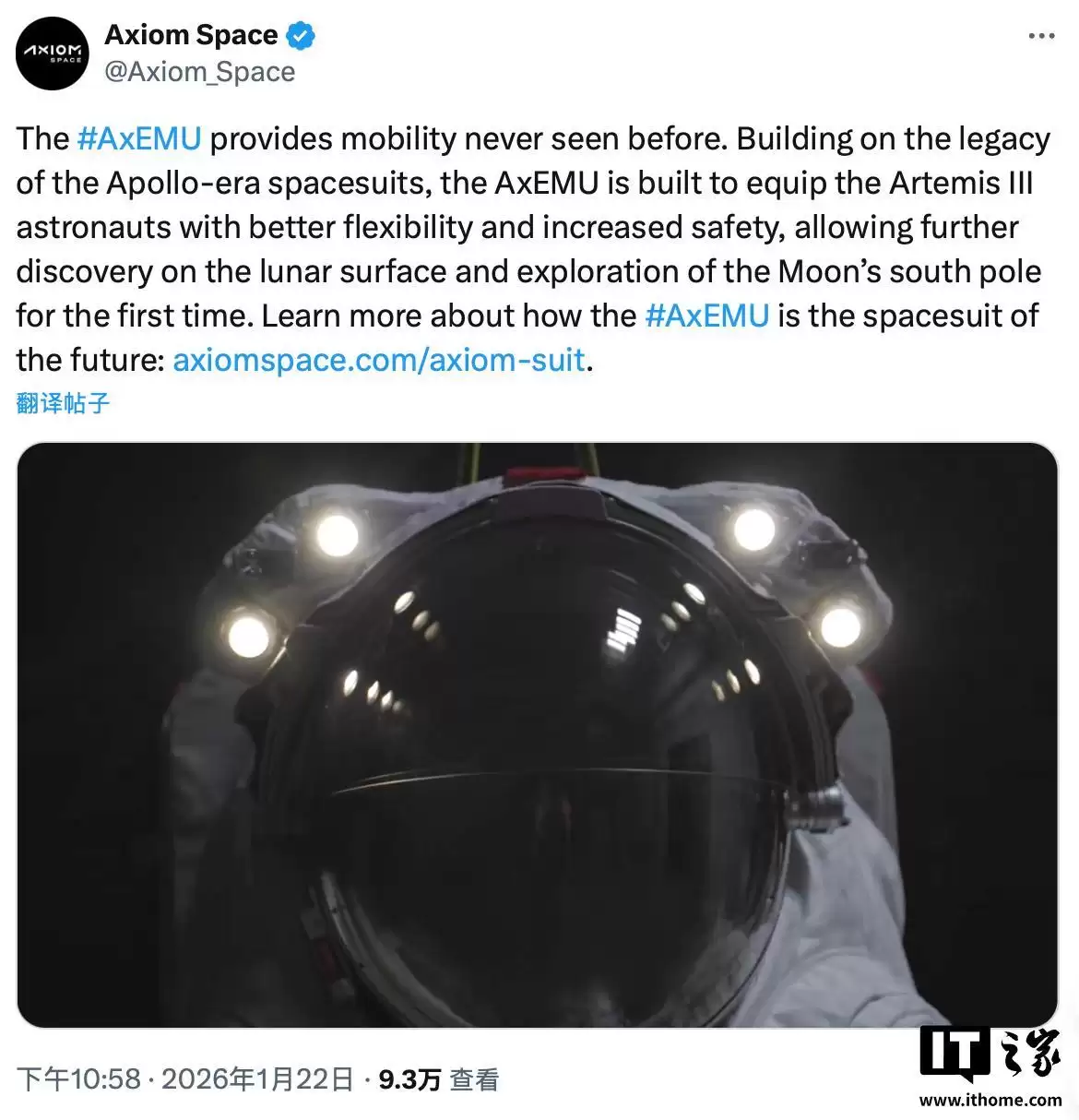 IT之家1月26日消息。随着NASA“阿尔忒弥斯二号”载人绕月任务接近,为后续登月计划准备的新一代宇航服研发取得重要进展。Axiom Space上周发布了一段视频,展示了其为NASA“阿尔忒弥斯三号”任务研发的AxEMU登月宇航服的测试情况。