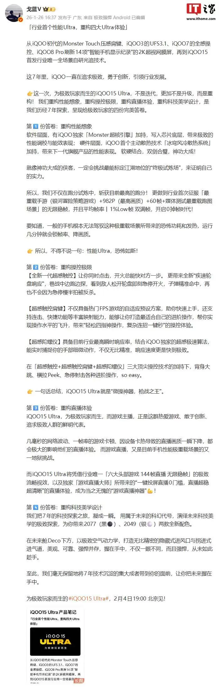 根据1月26日科技资讯,iQOO产品负责人戈蓝V今日发布长文,为即将到来的iQOO 15 Ultra新品预热。文中宣称,这款新机将“重构四大Ultra体验”,涵盖性能、操控、直播与设计多个维度。